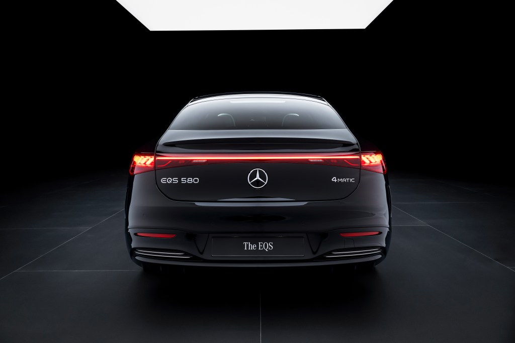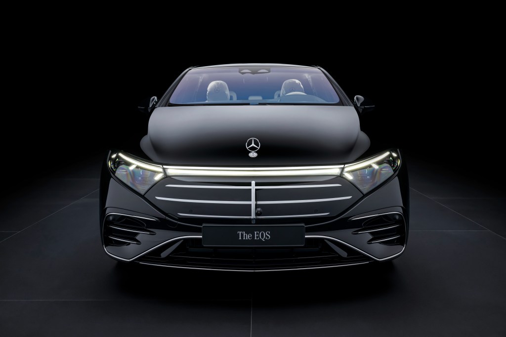 The distinguishing feature of the Mercedes‑EQ vehicles is the deep black radiator grille (black panel), which connects seamlessly with the headlights. The designers have now refined this independent face for the EQS: The electric flagship is equipped with a new radiator cover with chrome applications as standard in the Electric Art Line. Chrome-plated and flush-mounted slats create an elegant contrast to the deep black surroundings. This grille is combined with a standing star on the front hood and combines avant-garde EQ looks with the iconic, status-conscious Mercedes‑Benz symbol.